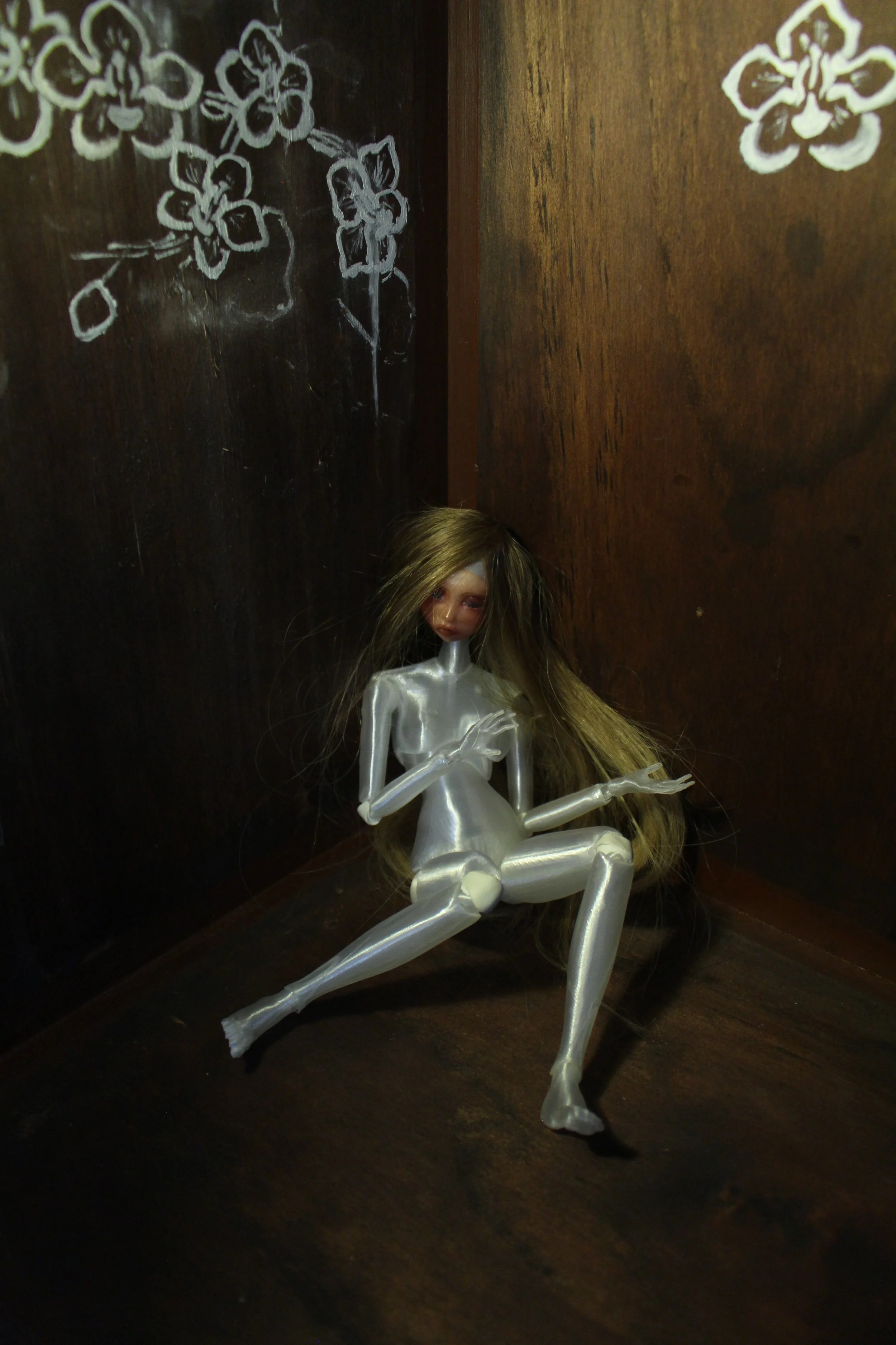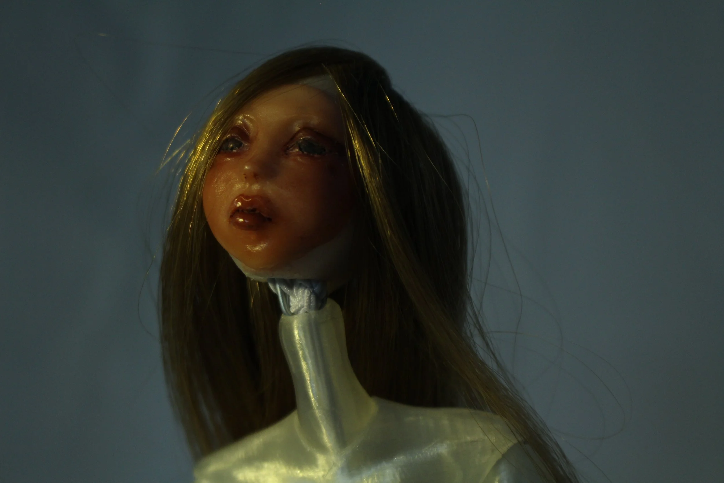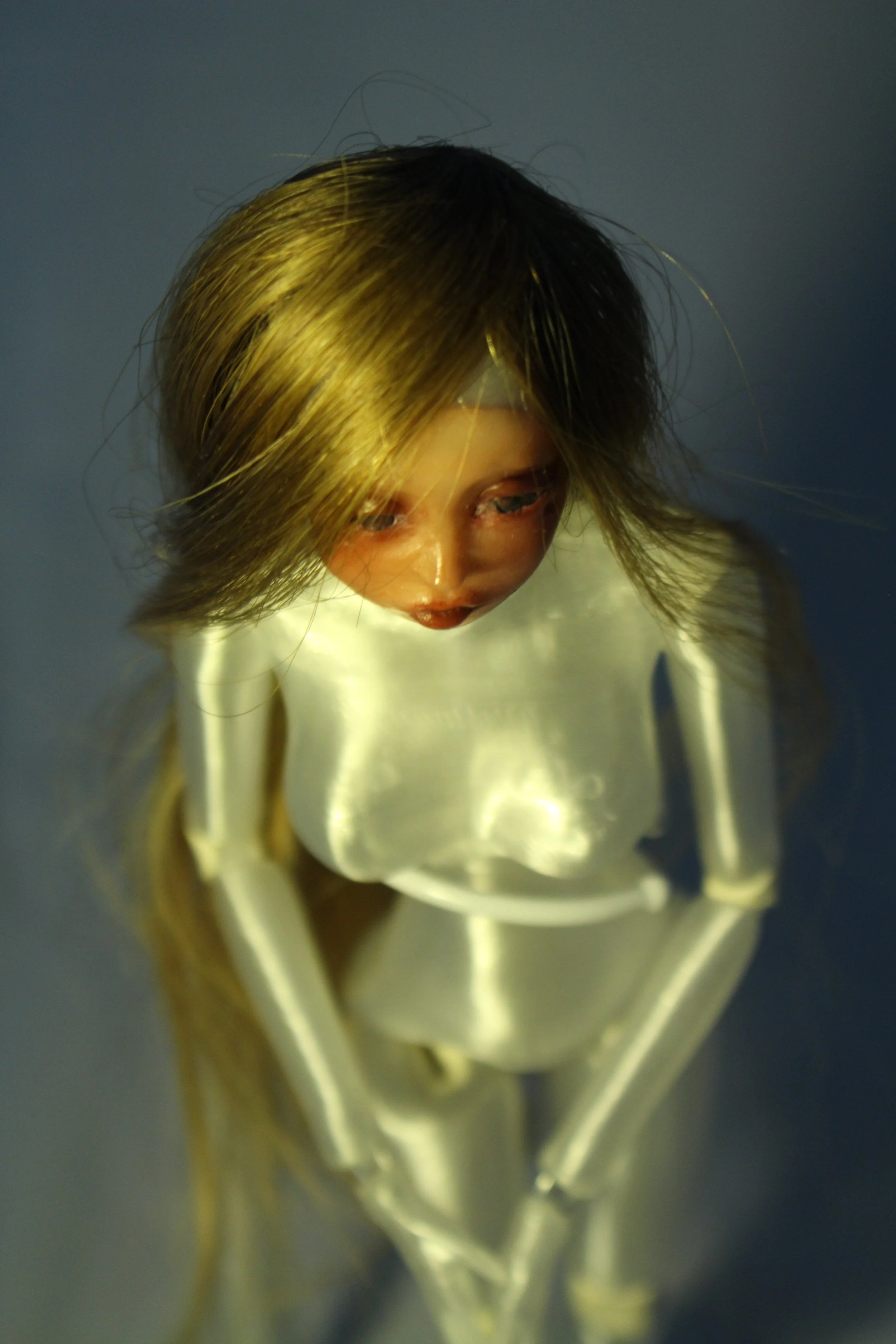 ‘Rejection’ explores the feelings of degradation connected to my experience as a woman. The subject is a hollow, ball-jointed doll unable to stand on its own. The face and hair suggest emotion and an organic life, but the body is frail and mechanical, poseable but not functional. When the head is removed, a mechanism within the neck is revealed. The viewer's presence completes the work, viewed as a voyeuristic experience.
