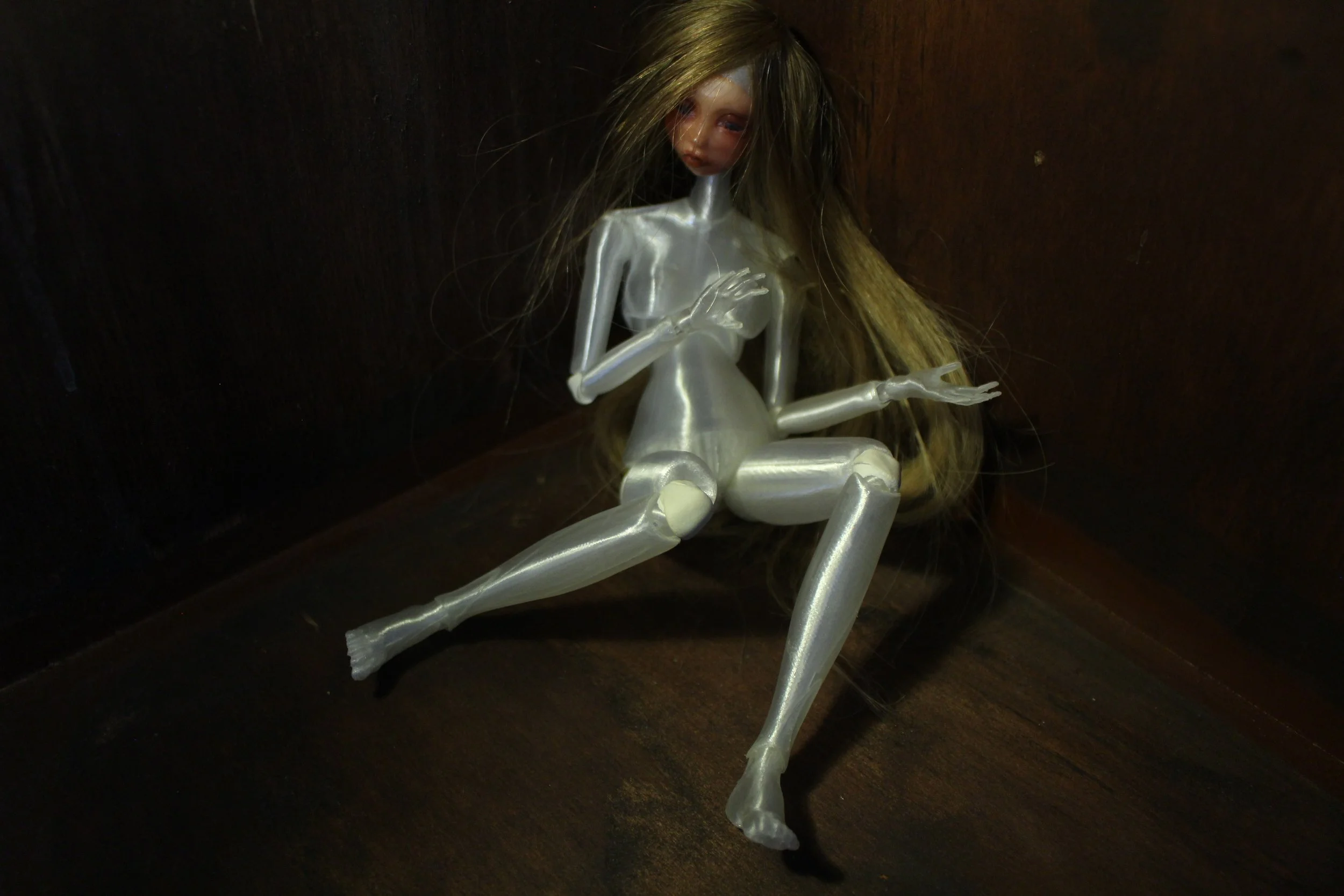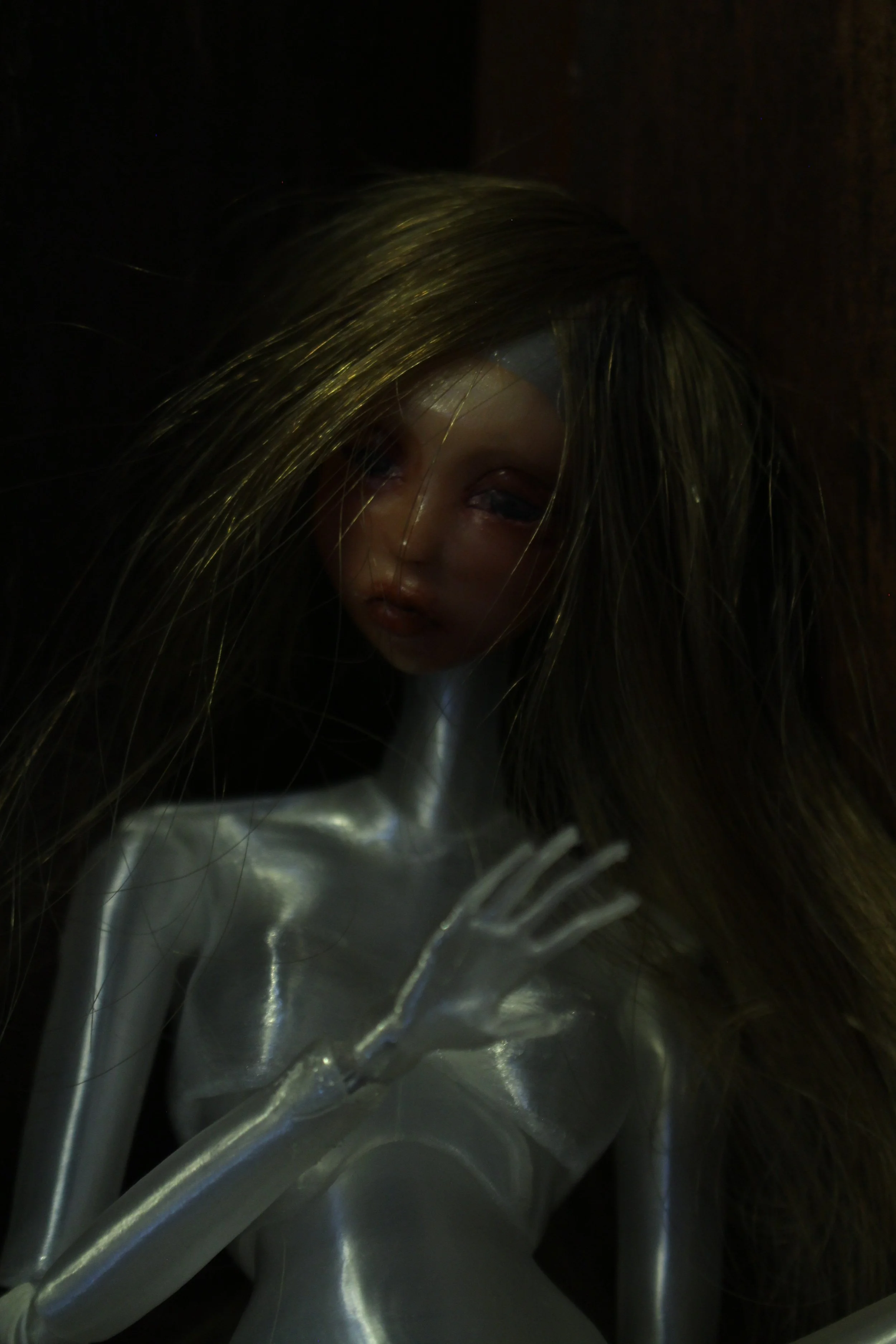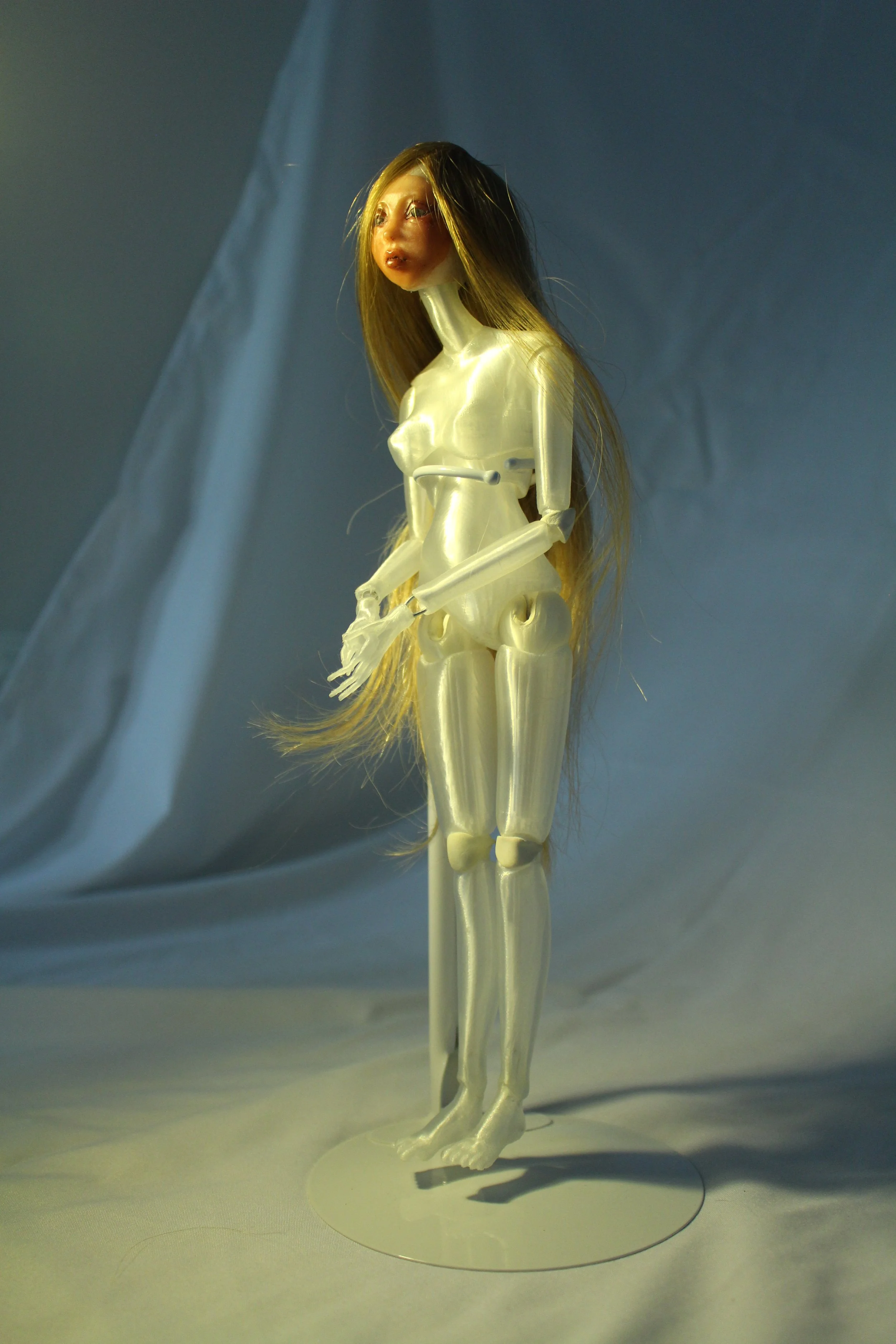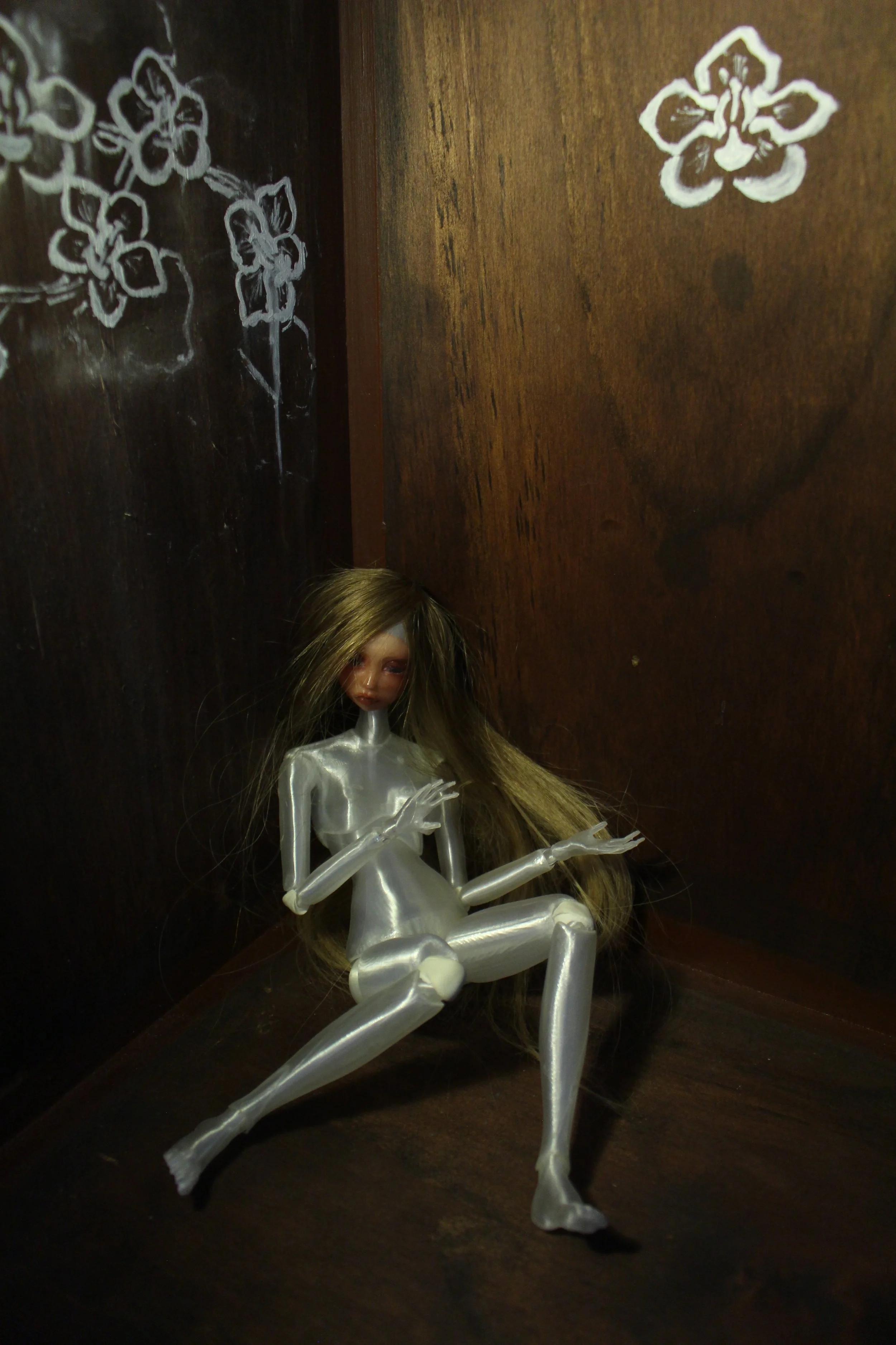 ‘Rejection’ explores the feelings of degradation connected to my experience as a woman. The subject is a hollow, ball-jointed doll unable to stand on its own. The face and hair suggest emotion and an organic life, but the body is frail and mechanical, poseable but not functional. When the head is removed, a mechanism within the neck is revealed. The viewer's presence completes the work, viewed as a voyeuristic experience.